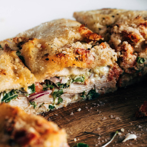 Preheat the oven to 400 degrees. Toast the focaccia in the oven for 5-8 minutes. Mix the pesto and the mayo together in a small bowl to make a pesto mayo. Keeping the bread flat on a cutting board, turn your serrated knife sideways and slice horizontally through the center of the loaf. (You don’t want to flip the top and lose those yummy crumbles.) Keeping the top piece flat, set it aside. Layer the sandwich with pesto mayo, turkey, tomato, greens, red onion, and finish with dollops of pesto mayo. I dollop the top layer of pesto mayo directly on top of the greens and onions so that I don’t have to flip my top piece upside down to spread it on the bread. Gently press your top piece back on top of the sandwich. When it’s nice and secure, use a large knife to cut through the sandwich. I usually cut it down the middle and across 3 times for a total of 6 pieces. Serve and enjoy! This is sandwich goals.